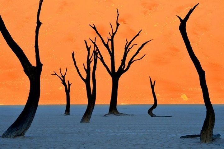 This amazing shot reveals the wondrous scenes in one of the driest places on earth. Giant sand dunes in the background cast an amber backdrop against the dark trees in the foreground.