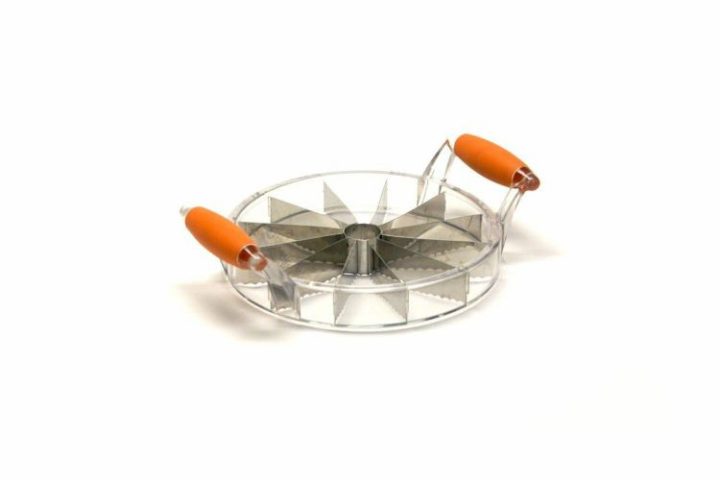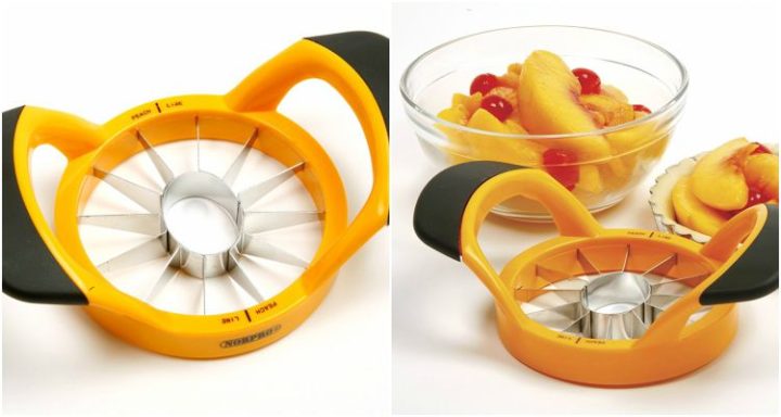 With large serrated steel blades and solid construction, the PROfreshionals Jumbo Fruit Slicer will slice any fruit into perfect wedges. Melons, apples, pineapple, and so many more are easily sliced with handy kitchen gadgets like this jumbo fruit slicer. Get it on Amazon.