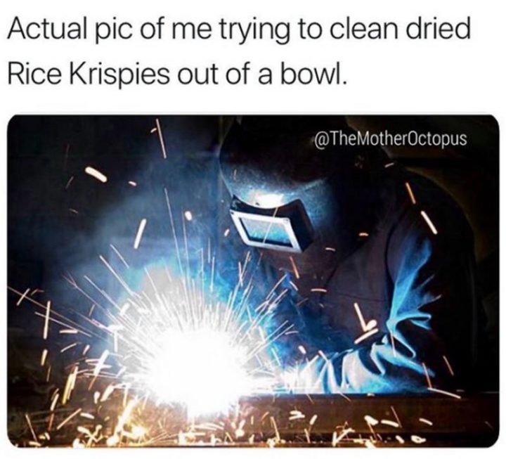 “Actual pic of me trying to clean dried Rice Krispies out of a bowl.”