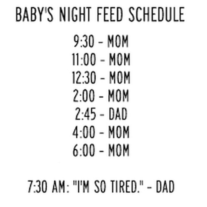 “Baby’s night feed schedule. 9:30 – mom. 11:00 – mom. 12:30 – mom. 2:00 – mom. 2:45 – dad. 4:00 – mom. 6:00 – mom. 7:30 AM: ‘I’m so tired.’ – dad.”