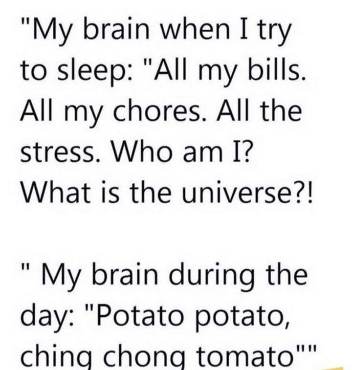“My brain when I try to sleep: All my bills. All my chores. All the stress. Who am I? What is the universe? My brain during the day: Potato potato, ching chong tomato.”