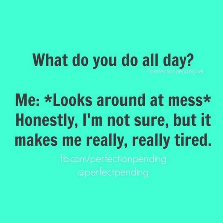 “What do you do all day? Me: *Looks around at mess* Honestly, I’m not sure, but it makes me really, really tired.”