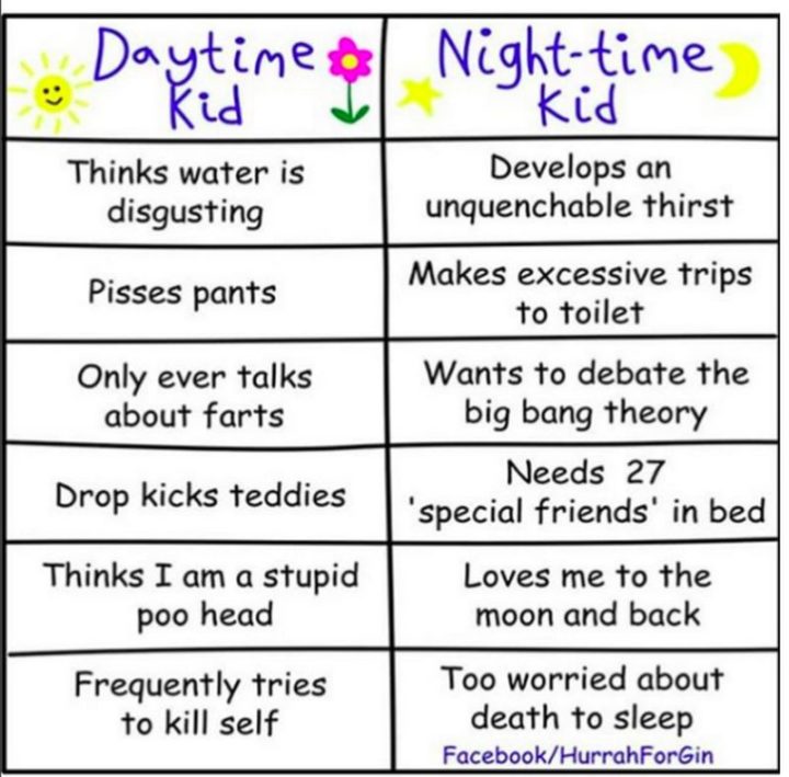 “Daytime kid: Thinks water is disgusting. Pisses pants. Only ever talks about farts. Dropkicks teddies. Thinks I am a stupid poohead. Frequently tries to kill self. Night-time kid: Develops an unquenchable thirst. Makes excessive trips to the toilet. Wants to debate the big bang theory. Needs 27 ‘special friends’ in bed. Loves me to the moon and back. Too worried about death to sleep.”