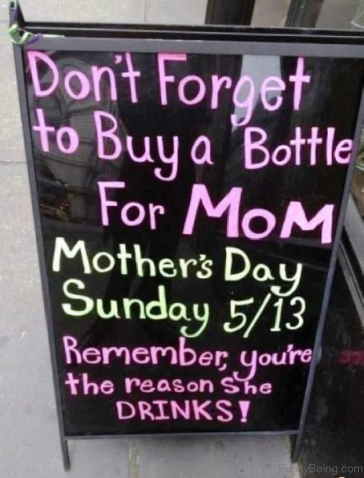 “Don’t forget to buy a bottle for mom. Mother’s Day Sunday 5/13. Remember, you’re the reason she drinks!”