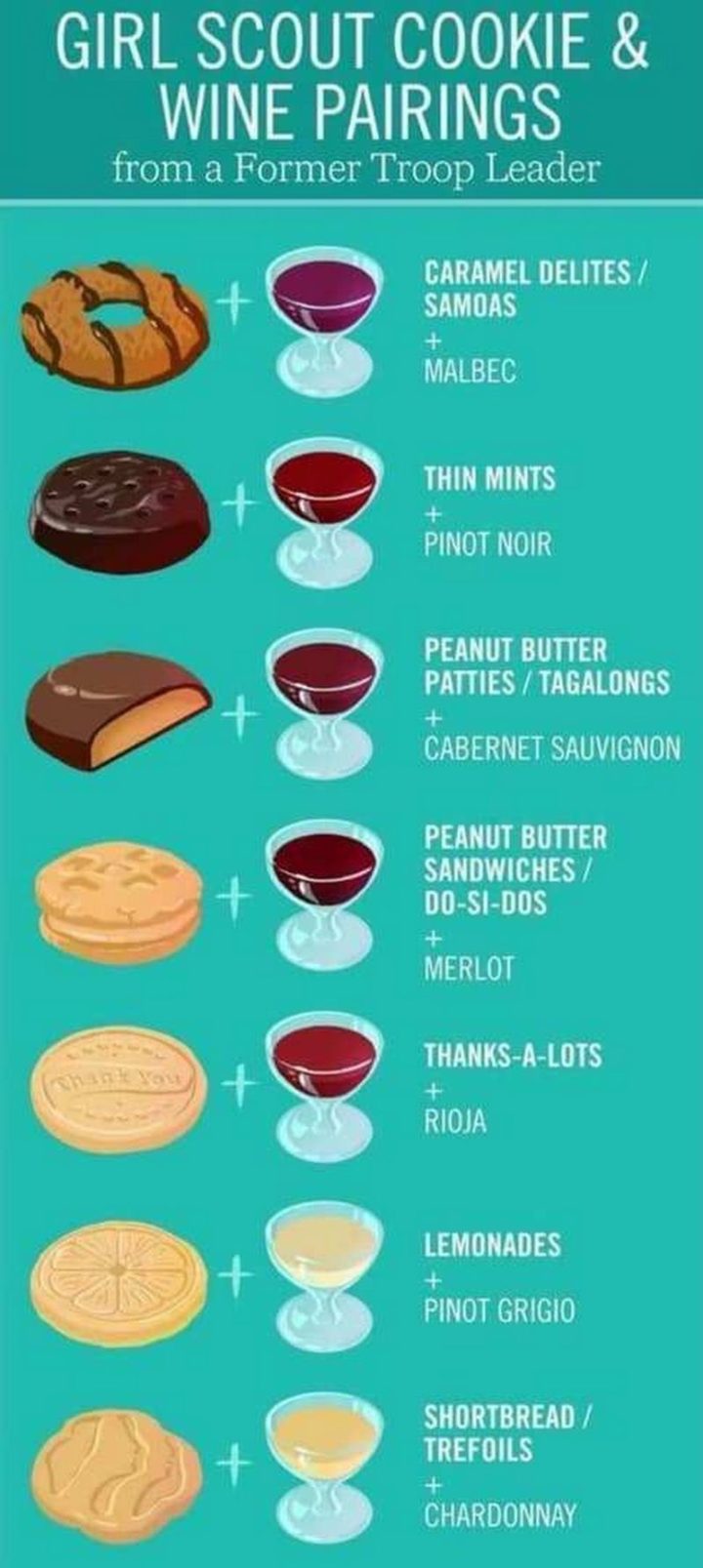 “Girl Scout Cookie & Wine Pairings from a Former Troop Leader. Caramel Delites / Samdas + Malbec. Thin Mints + Pinot Noir. Peanut Butter Patties / Tagalongs + Cabernet Sauvignon. Peanut Butter Sandwiches / Do-Si-Does + Merlot. Thanks-A-Lots + Rioja. Lemonades + Pinot Grigio. Shortbread / Trefoils + Chardonnay.”