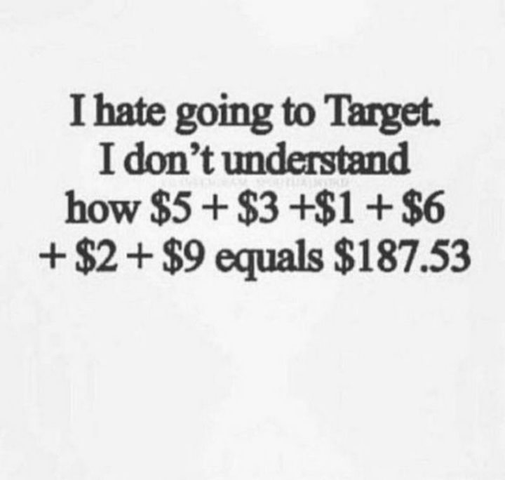 “I hate going to Target. I don’t understand how $5 + $3 + $1 + $6 +$2 + $9 equals $187.53.”
