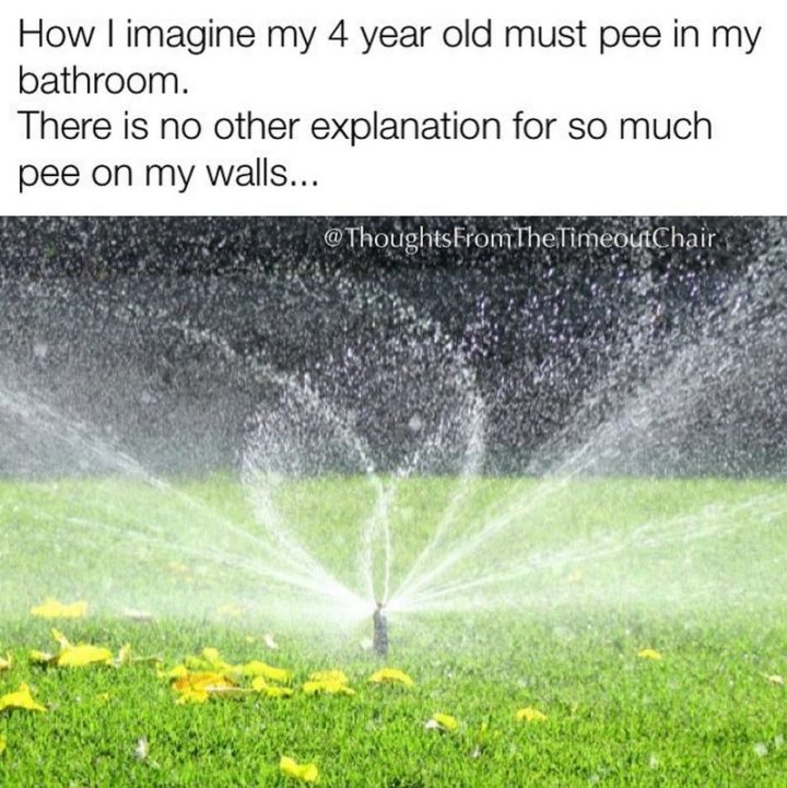 “How I imagine my 4-year-old must pee in my bathroom. There is no other explanation for so much pee on my walls…”