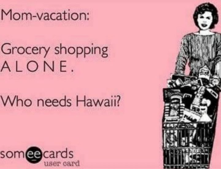 “Mom-vacation: Grocery shopping ALONE. Who needs Hawaii?”