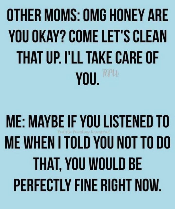 “Other moms: OMG honey are you okay? Come let’s clean that up I’ll take care of you. Me: Maybe if you listened to me when I told you not to do that, you would be perfectly fine right now.”