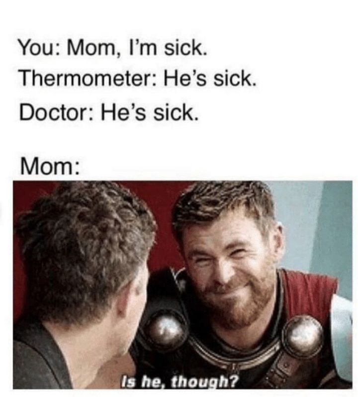 “You: Mom, I’m sick. Thermometer: He’s sick. Doctor: He’s sick. Mom: Is he, though?”