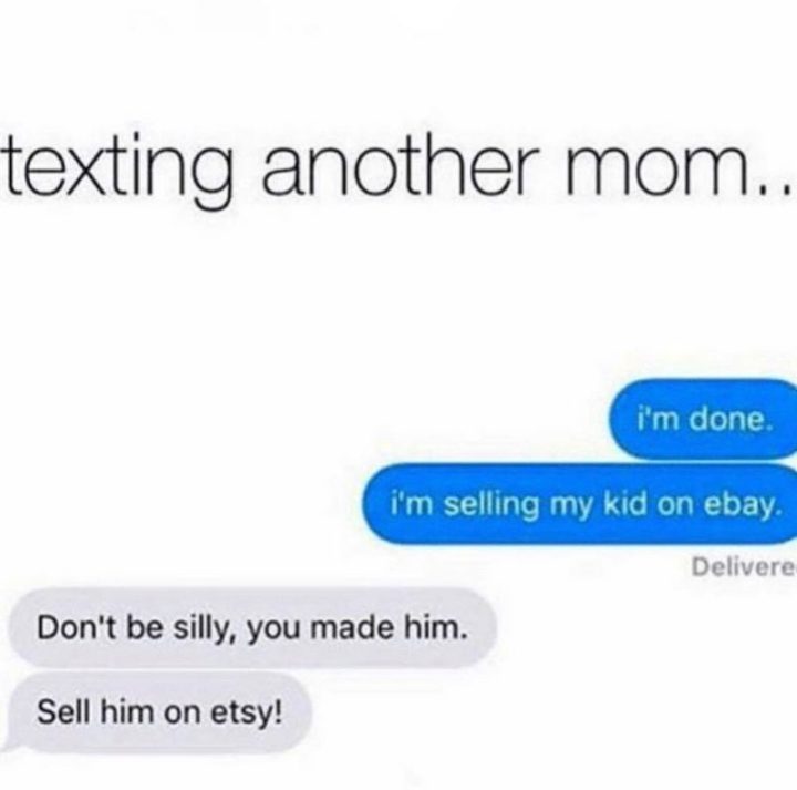 “Texting another mom…I’m done. I’m selling my kid on eBay. Don’t be silly, you made him. Sell him on Etsy!”