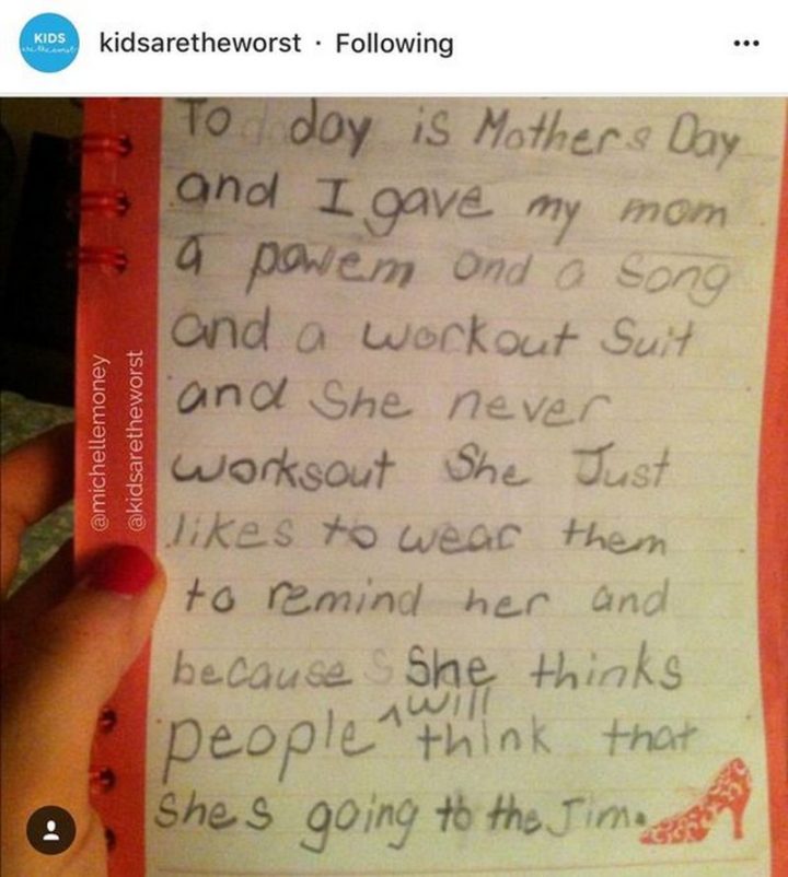 “Today is Mother’s Day and I gave my mom a poem and a song and a workout suit and she never works out. She just likes to wear them to remind her and because she thinks people will think that she’s going to the gym.”