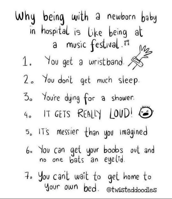 “Why being with a newborn baby in a hospital is like being at a music festival. 1) you get a wristband. 2) You don’t get much sleep. 3) You are dying for a shower. 4) IT GETS REALLY LOUD! 5) It’s messier than you imagined. 6) You can get your boobs out and no one bats an eyelid. 7) You can’t wait to get home to your own bed.”