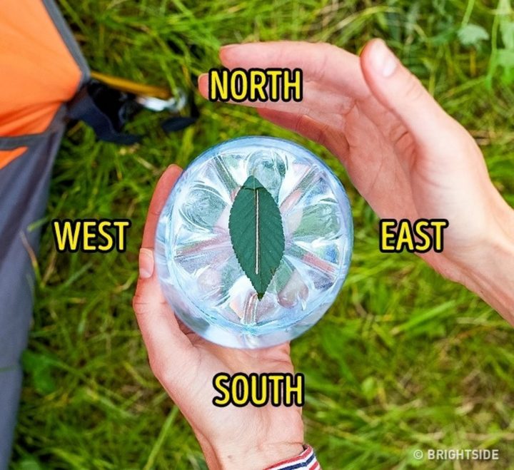You’re probably aware that it’s easy to walk around in circles in a forest without realizing it. Help stay on course with a makeshift compass. Simply place a leaf in a glass of water. Then, magnetize the end of a pin or needle by rubbing it onto your clothes repeatedly for about a minute (or at least 100 times) and carefully place the threading needle atop the leaf. The magnetized end will point north.