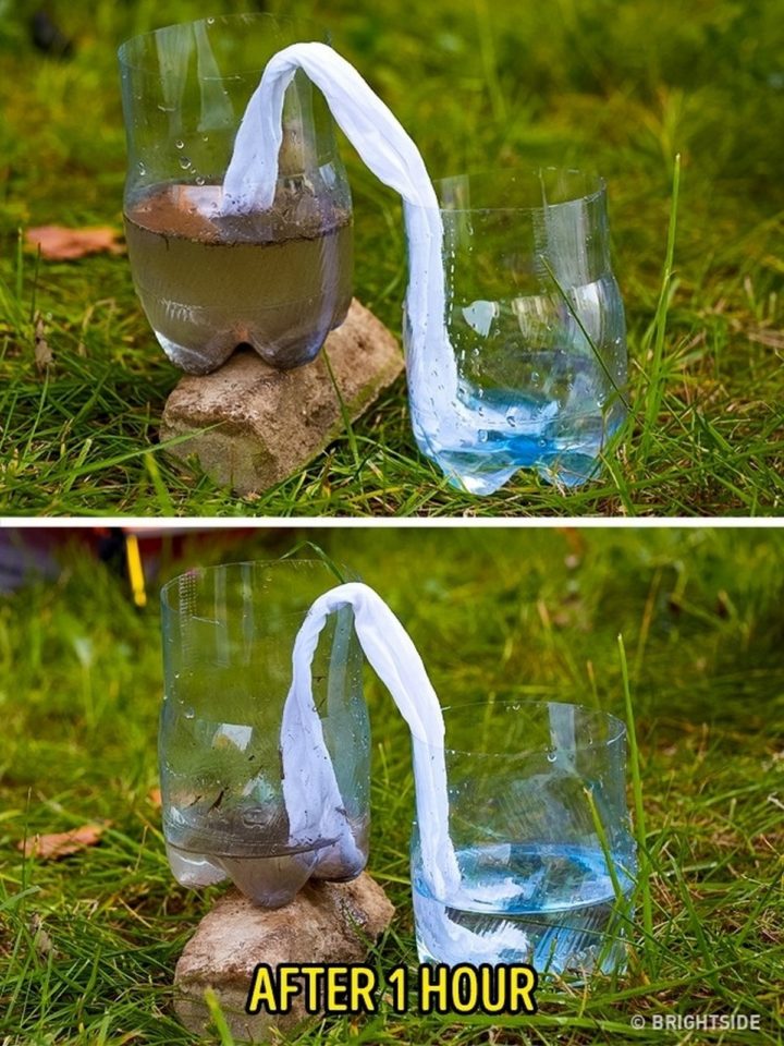 Your body needs water to survive and getting fresh water, even a little in survival situations. All you need is two containers and a t-shirt or other clean fabric. Place the container of dirty water elevated above another container and place the t-shirt so that both ends are at the bottom of both buckets. You’ll start to get clean water within an hour but as a precaution, it’s best to boil it first.
