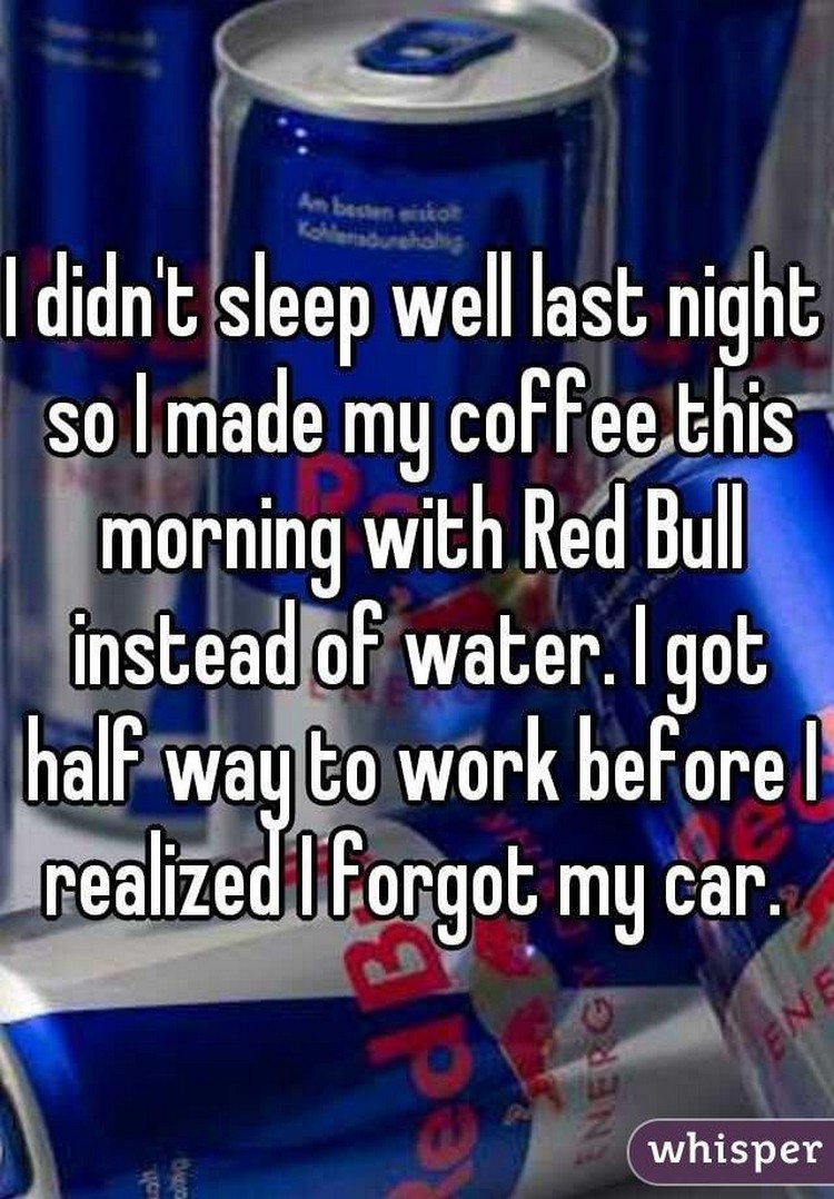 “I didn’t sleep well last night so I made my coffee this morning with Red Bull instead of water. I got half way to work before I realized I forgot my car.”