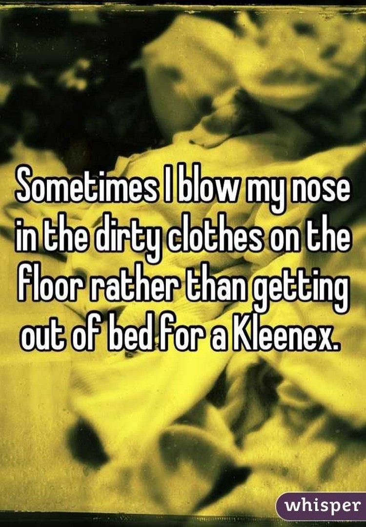 “Sometimes I blow my nose in the dirty clothes on the floor rather than getting out of bed for Kleenex.”