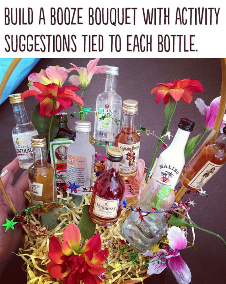 Build a booze bouquet with activity suggestions tied to each bottle.