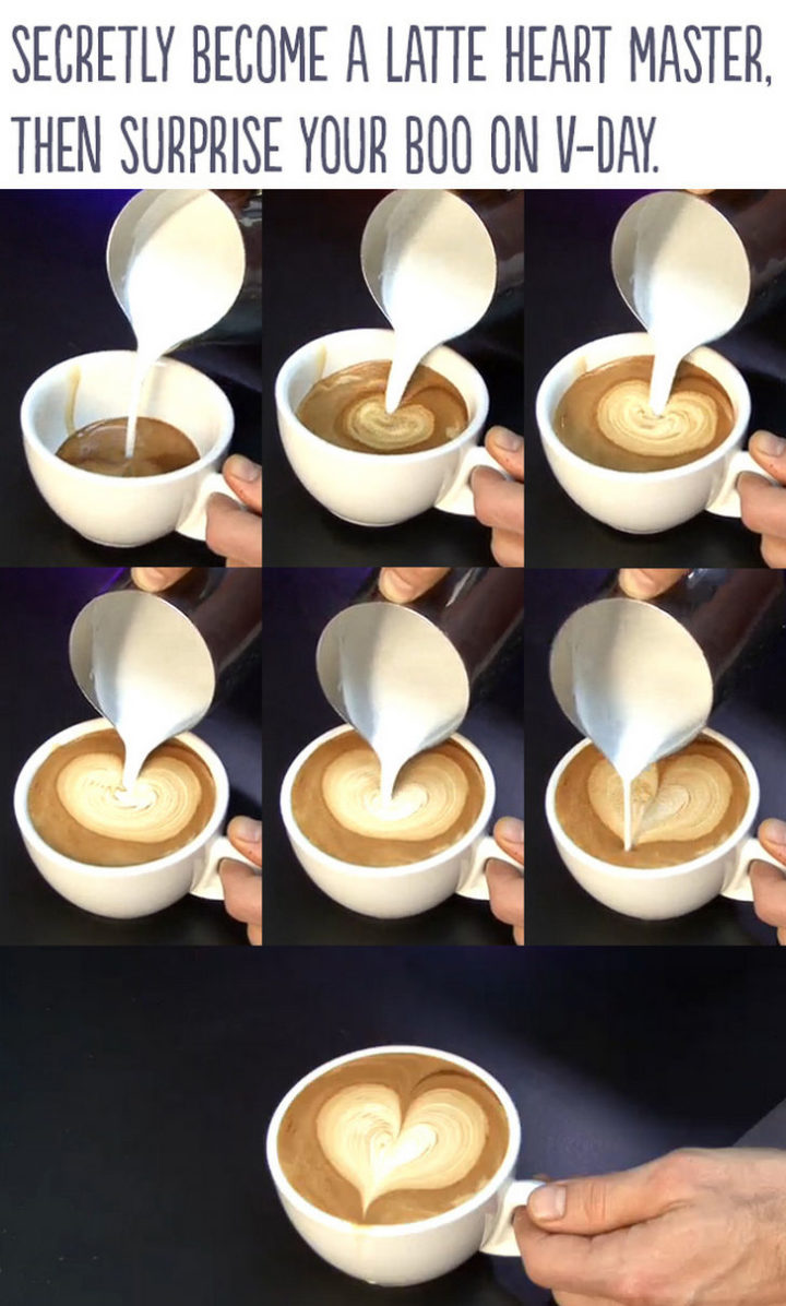 Secretly become a latte heart master, then surprise your boo on Valentine’s Day. Learn how to create latte art and pour a heart or use the coffee heart stencil trick.