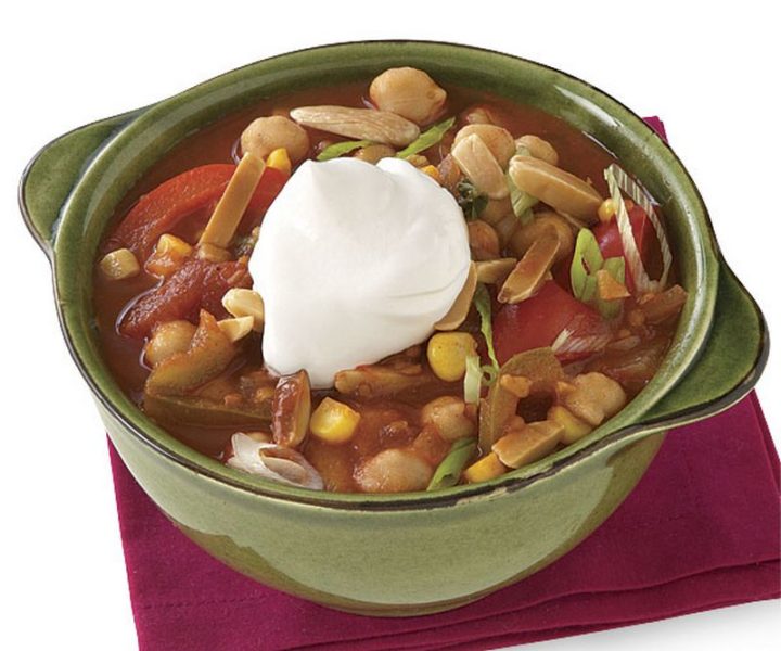 A great vegetarian chili recipe and fried almonds provide great texture. Get the recipe!