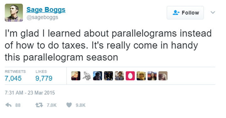“I’m glad I learned about parallelograms instead of how to do taxes. It’s really come in handy this parallelogram season.”