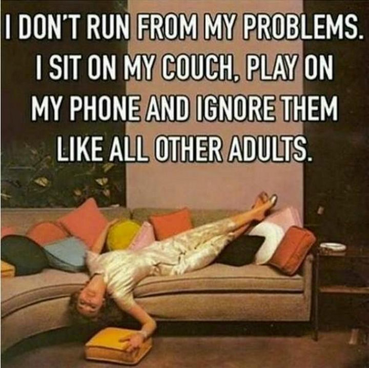 “I don’t run from my problems. I sit on my couch, play on my phone, and ignore them like all other adults.”