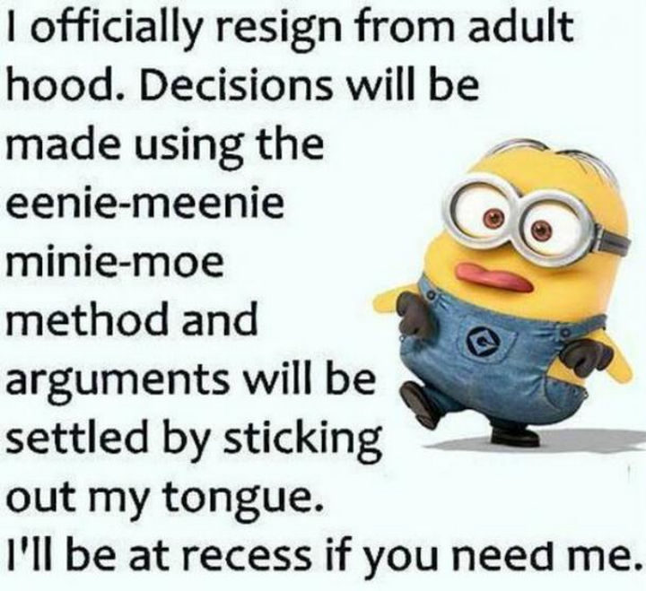 “I officially resign from adulthood. Decisions will be made using the eenie-meenie-minie-moe method and arguments will be settled by sticking out my tongue. I’ll be at recess if you need me.”