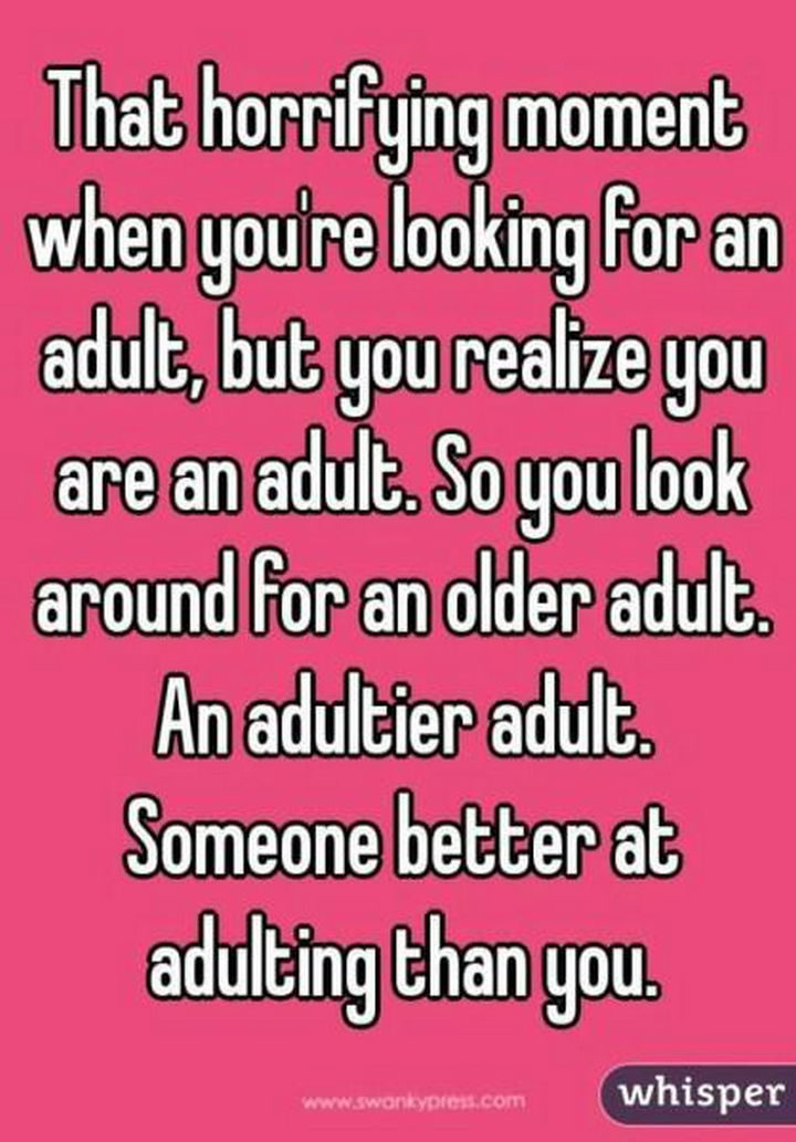 “That horrifying moment when you’re looking for an adult, but you realize you are an adult. So you look around for an older adult. An adultier adult. Someone better at adulting than you.”