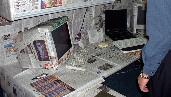 Office Pranks #1: A good way to recycle AND catch up on some headlines.