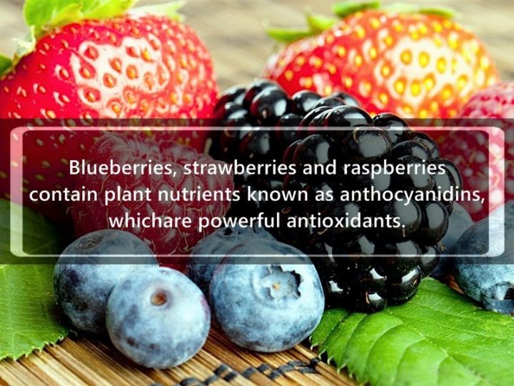 Blueberries, strawberries, and raspberries contain plant nutrients known as anthocyanidins which are powerful antioxidants.