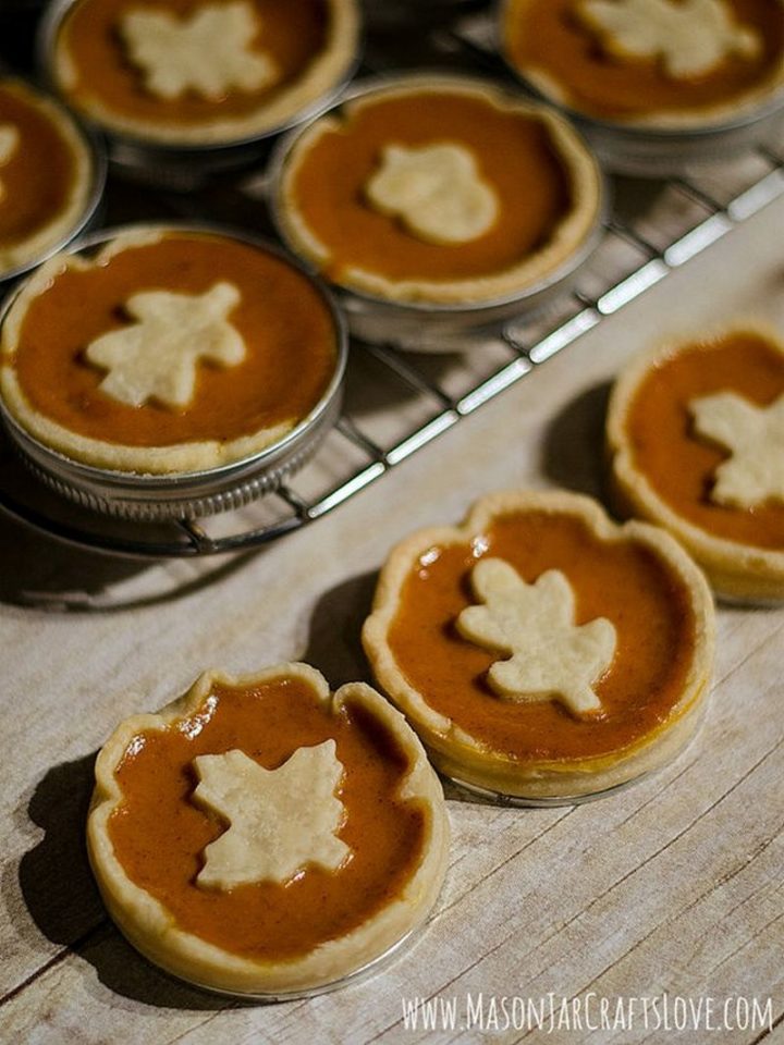 Cute little pumpkin pies baked in mason jar lids. Get the recipe!
