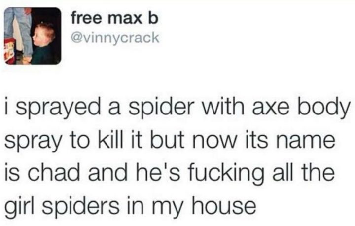 “I sprayed a spider with Axe body spray to kill it but now its name is Chad and he’s [censored] all the girl spiders in my house.