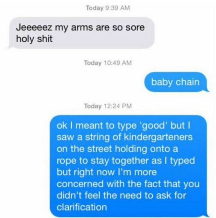 ![31 Funny Texts - "Jeez, my arms are so sore holy [censored]. Baby chain. Ok, I meant to type 'good' but I saw a string of kindergartners on the street holding onto a rope to stay together as I typed but right now I'm more concerned with the fact that you didn't feel the need to ask for clarification."](https://www.winkgo.com/wp-content/uploads/2022/05/funny-texts-04-720x725.jpg)