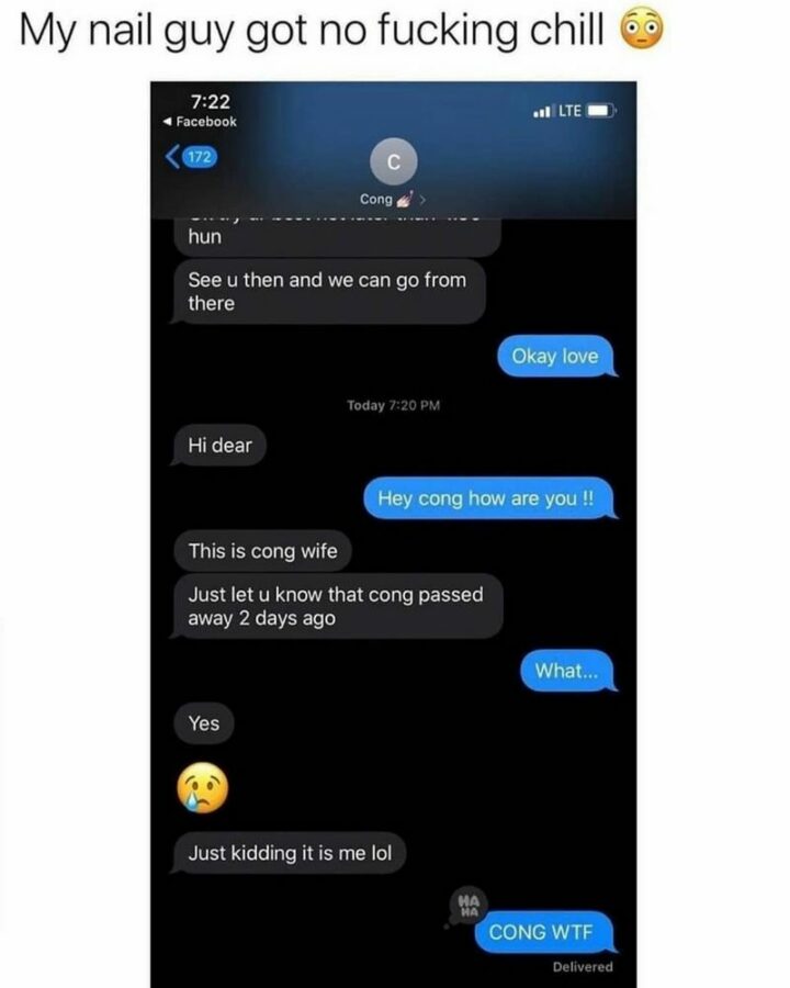 !["My nail guy got no [censored] chill. See u then and we can go from there. Okay, love. Hi dear. Hey Cong how are you!!! This is Cong's wife. Just let u know that Cong passed away 2 days ago. What...Yes. Just kidding it is me LOL. Cong WTF."](https://www.winkgo.com/wp-content/uploads/2022/05/funny-texts-17-720x900.jpg)