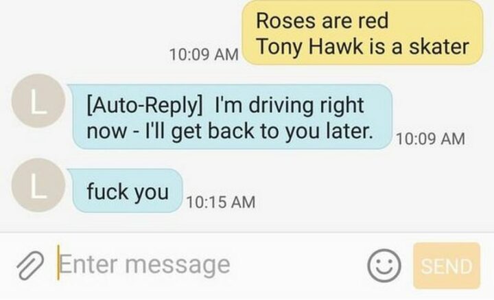 19) “Roses are red, Tony Hawk is a skater. [Auto-Reply] I’m driving right now – I’ll get back to you later. [censored] you.”