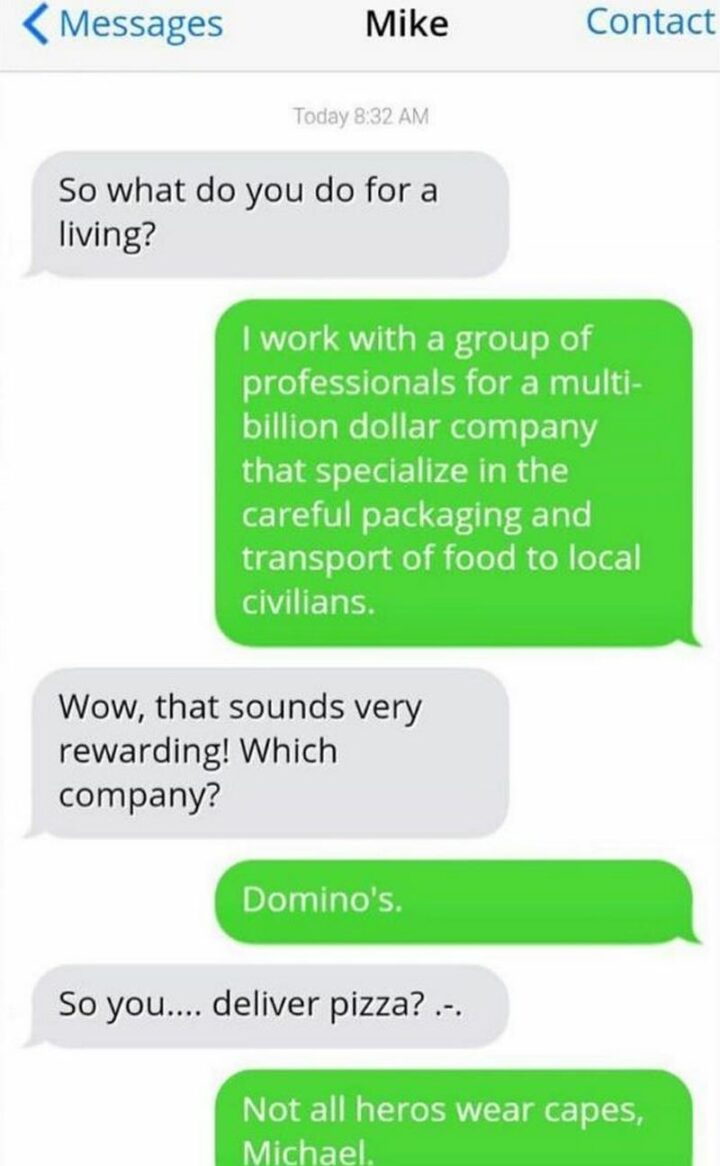 20) “So what do you do for a living? I work with a group of professionals for a multi-billion dollar company that specializes in the careful packaging and transport of food to local civilians. Wow, that sounds very rewarding! Which company? Domino’s. So you…Deliver pizza? Not all heroes wear capes, Michael.”