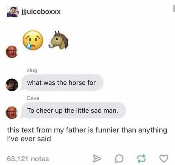 28) “This text from my father is funnier than anything I’ve ever said: What was the horse for. To cheer up the little sad man.”