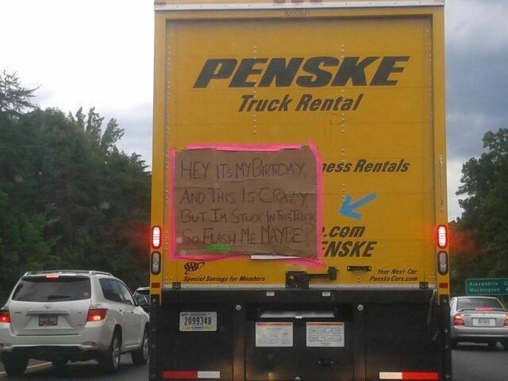 “Hey, it’s my birthday and this is crazy but I’m stuck in this truck. So flash me maybe?”