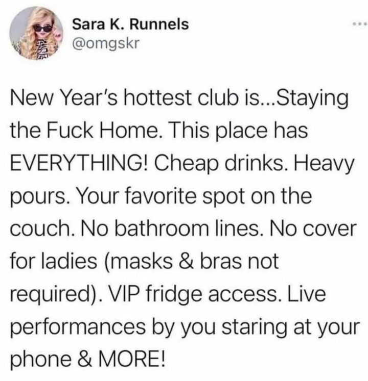 “New Year’s hottest club is…Staying the [censored] Home. This place has EVERYTHING! Cheap drinks. Heavy pours. Your favorite spot on the couch. No bathroom lines. No cover for ladies (masks and bras are not required). VIP fridge access. Live performances by you staring at your phone and MORE!”