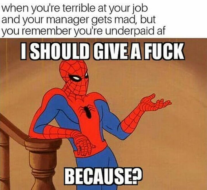 !["When you're terrible at your job and your manager gets mad, but you remember you're underpaid AF: I should give a [censored] because?"](https://www.winkgo.com/wp-content/uploads/2022/07/spider-man-memes-27-720x662.jpg)