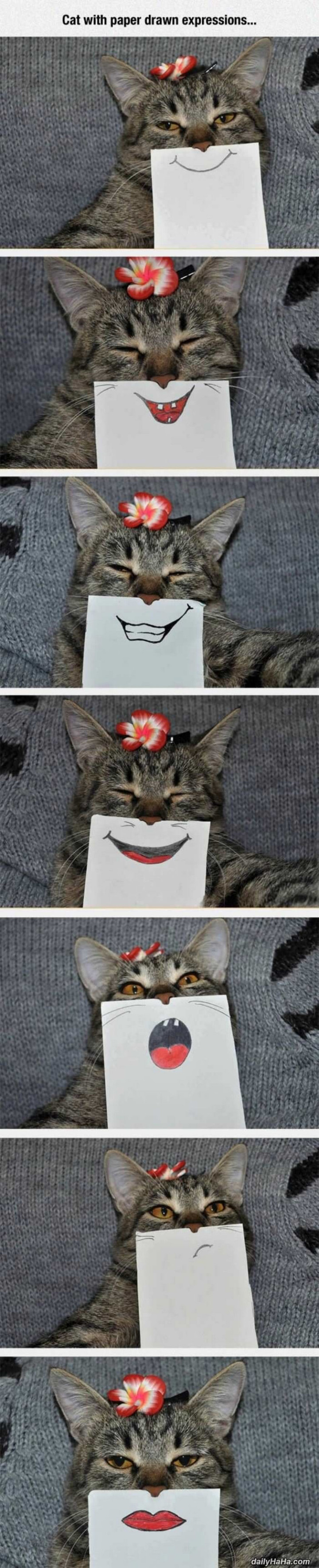 “Cat with paper drawn expressions…”