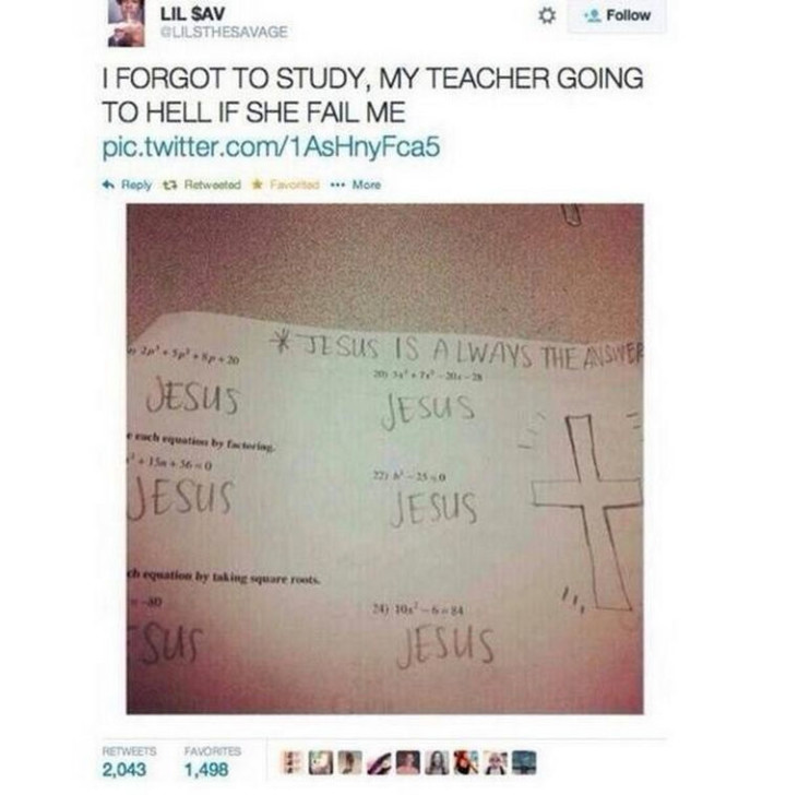“I forgot to study, my teacher going to hell if she fails me.”