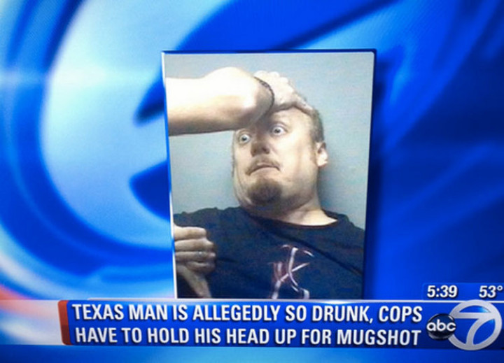 “Texas man is allegedly so drunk, cops have to hold his head up for mugshot.”