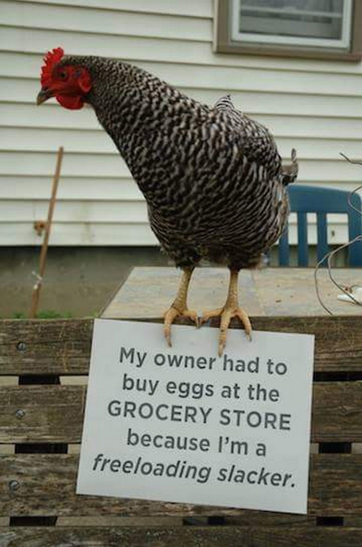 “My owner had to buy eggs at the grocery store because I”m a freeloading slacker.”