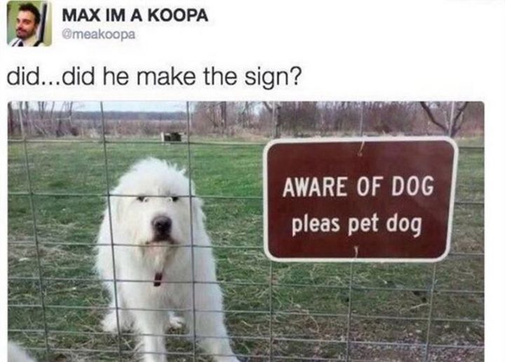 “Did…Did he make the sign? Aware of dog. Please pet dog.”