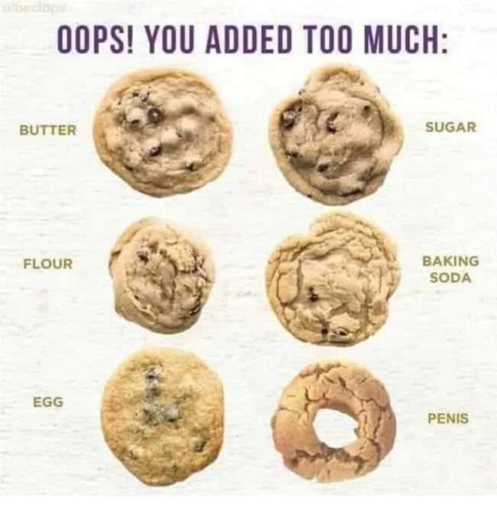 “Oops! You added too much: Butter. Sugar. Flour. Baking soda. Egg. [censored].”