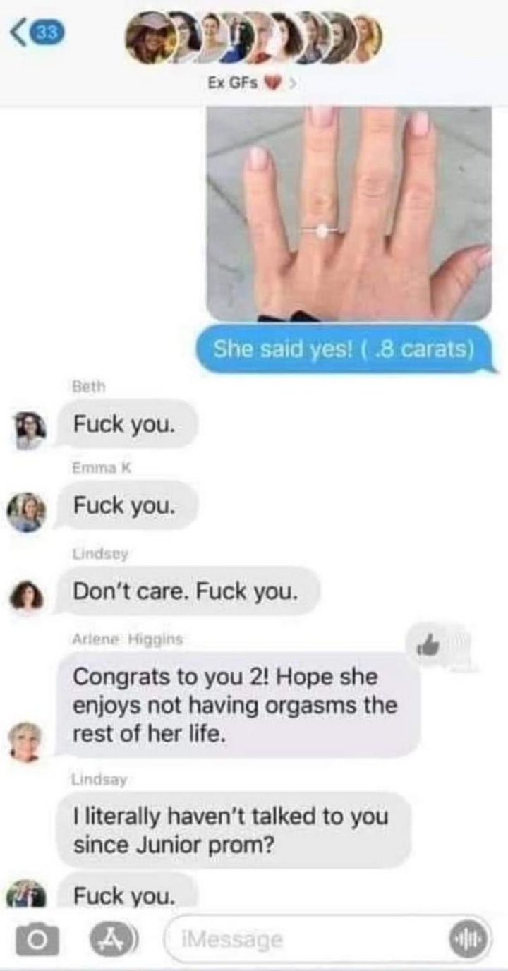 !["She said yes! (.8 carats) Beth:[censored] you. Emma: [censored] you. Lindsey: Don't care. [censored] you. Arlene: Congrats to you 2! Hope she enjoys not having [censored] for the rest of her life. Lindsay: I literally haven't talked to you since Junior prom? [censored] you."](https://www.winkgo.com/wp-content/uploads/2020/09/funny-pictures-56-720x1376.jpg)