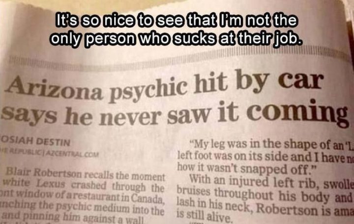 “Arizona psychic hit by car says he never say it coming: It’s so nice to see that I’m not the only person who sucks at their job.”