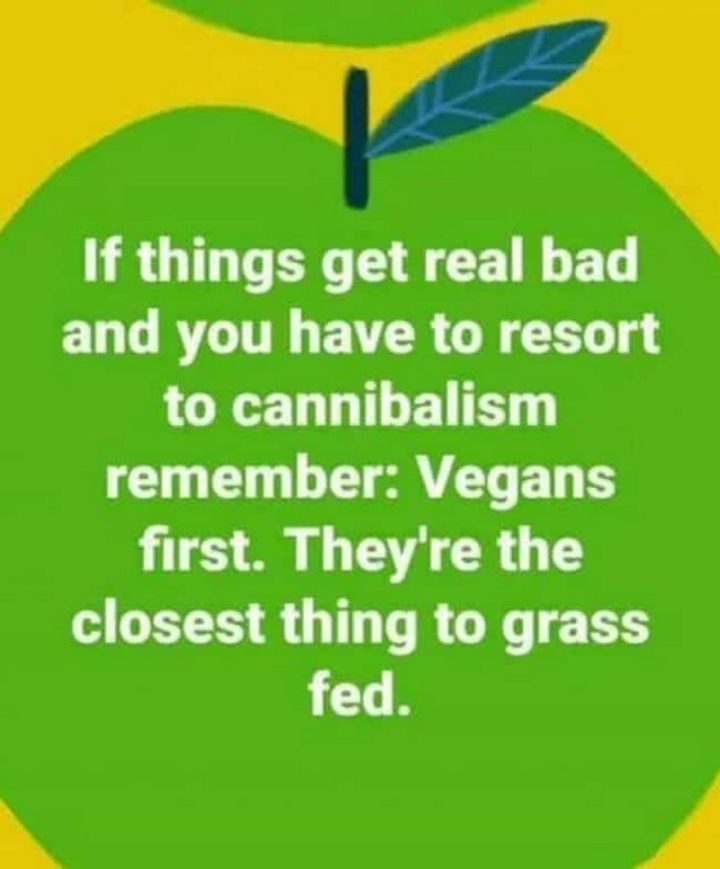 “If things get really bad and you have to resort to cannibalism, remember: Vegans first. They’re the closest thing to grass-fed.”