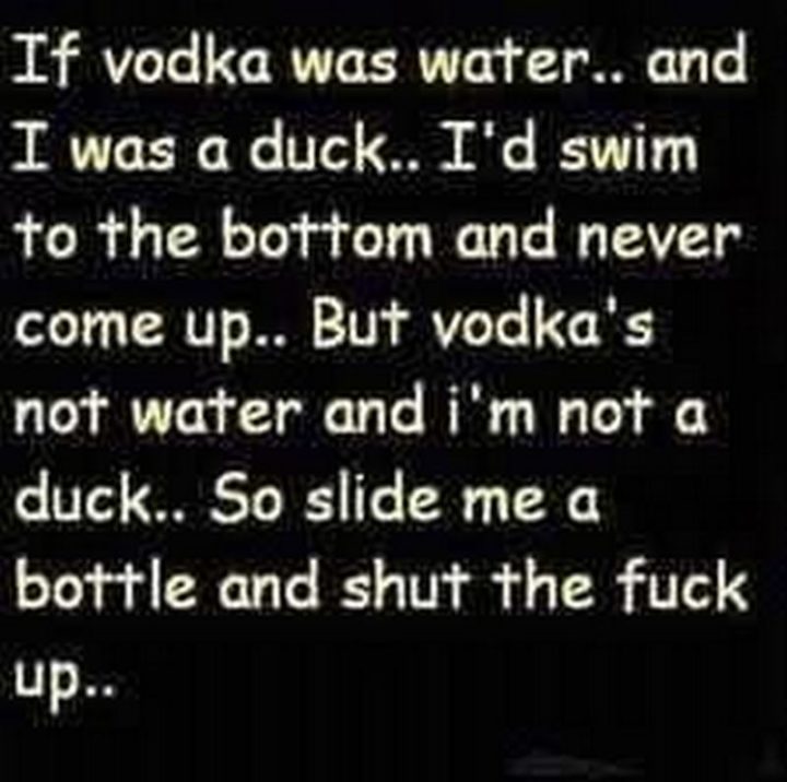 !["If vodka was water...And I was a duck...I'd swim to the bottom and never come up...But vodka's not water and I'm not a duck...So slide me a bottle and shut the [censored] up..."](https://www.winkgo.com/wp-content/uploads/2020/09/funny-pictures-68-720x716.jpg)